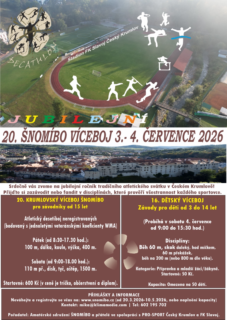 Zveme vás na jubilejní 20. ročník Krumlovského desetiboje ŠNOMÍBO, který se uskuteční 3.–4. 7. 2026 (pátek–sobota) v Českém Krumlově. Čeká vás 10 pestrých disciplín, přátelská atmosféra a bohatý doprovodný program pro závodníky i fanoušky. Závod je určen amatérům, sportovním nadšencům i týmům přátel, kteří chtějí společně zažít víkend plný pohybu a zábavy. Kapacita je omezená, proto si své místo včas rezervujte a staňte se součástí tradiční sportovní akce v srdci Českého Krumlova.